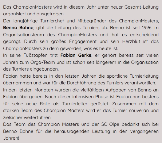• Champion Masters unter neuer Leitung